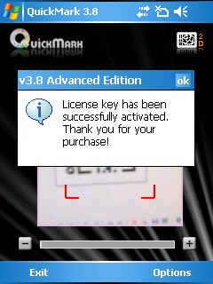 完成資料填寫與付款程序後,請檢查您的 email 信箱,我們將寄給您一個連結。該連結會連回 QuickMark 網站並提供一個啟用條碼。 開啟 QuickMark 掃描該條碼後即可取得授權,升級成QuickMark 進階版!