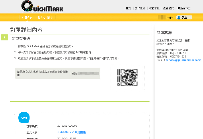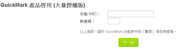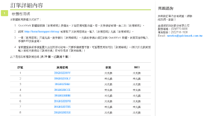 交易完成後,Project Leader 將會收到一封 QuickMark 通知信,透過信中的連結可來到 QuickMark 網站查詢 已購買的啟用密碼。Project Leader 接著需要將這些密碼發放給 Project User,而各個 Project User 可自行到 QuickMark 網站以啟用密碼兌換一組授權條碼。