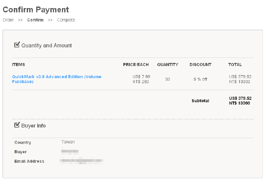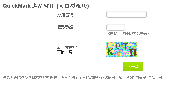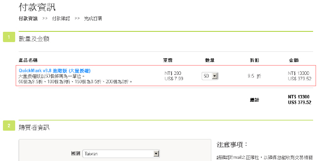 下列步驟將示範如何進行 QuickMark 進階版大量授權的購買與啟用。(註冊會員與下載程式等步驟與單筆購買相同,在此省略)。
