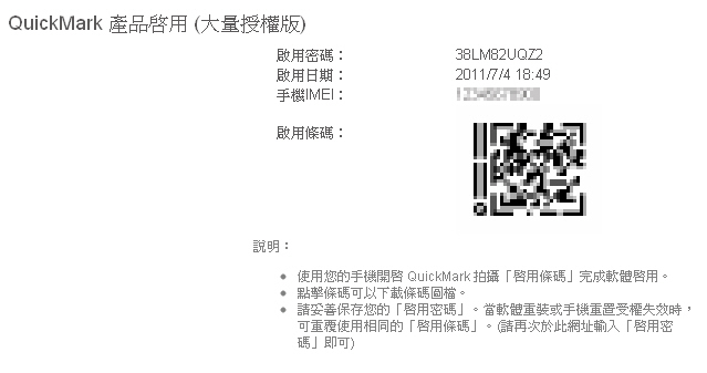 當 Project User 接收到來自於 Project Leader 所提供的啟用密碼後,可自行到 QuickMark 網站的授權條碼兌換頁面 依據網頁的提示輸入所需資訊以取得授權條碼。當授權條碼在畫面上產生後,請開啟 QuickMark 並讀取該條碼即可 (使用者需先下載安裝 QuickMark)。